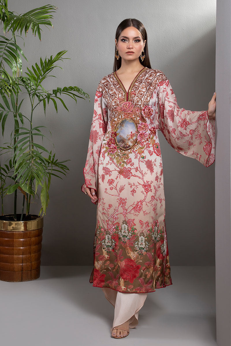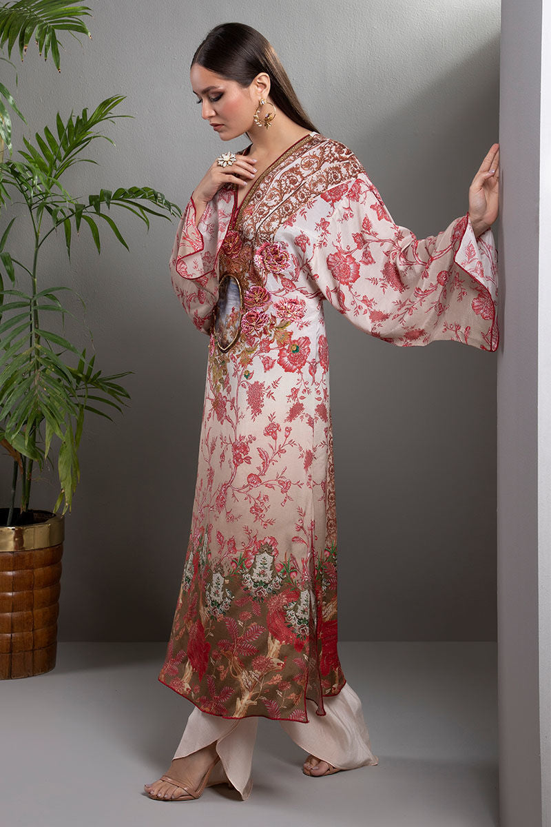 Beautiful flowy original Shamaeel's Kaftaan silhouette delicately stitched in silk fabric. It features layers of beautiful original Shamaeel prints. Precisely handcrafted floral embroideries and enhanced with sitara work paired with ivory pants.