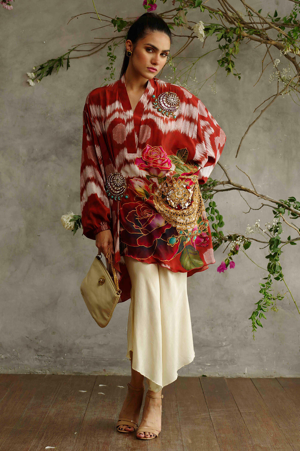 Silk tunic with original in-house prints and hand worked embroidery.