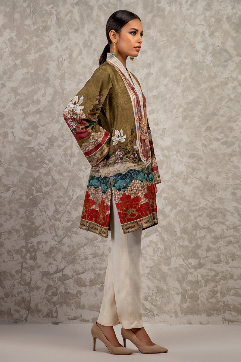 Short straight silhouette print on silk fabric. Chinese Art inspired ornaments. White resham thread handmade geometric galla patti enhanced with gold tila thread beautiful floral resham thread embroidered motif enhanced with zardzoi work appliqued on the shirt. Can be paired with pants as shown in the picture.
