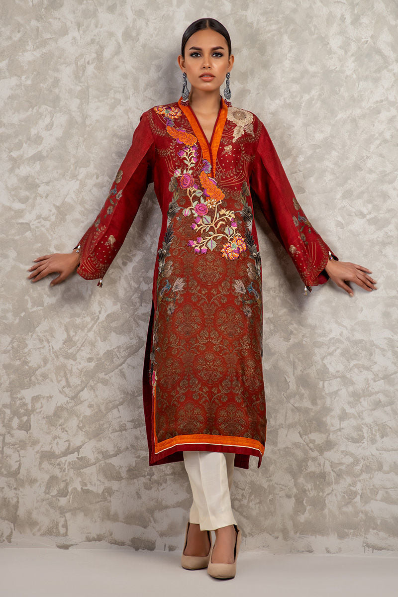 Straight kurta style in traditional print inspired by French Era. A richly detailed design featuring a blend of floral and original Shamaeel print. Delicate hand stitch work in mint green and coffee resham thread, antique gold tila craft on a vintage print canvas. Beautiful intricate hand crafted neckline designed by using sequence work and resham thread. Can be paired with solid matching pants or pants as shown in the picture