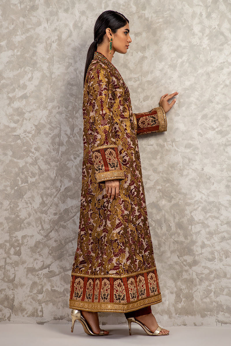 Traditional style long silhouette print on silk fabric Ottoman Textile inspired print overall antique gold embroidery on the shirt beautiful traditional printed kaali on the front Mughal Mehrab inspired border on the shirt and sleeves heavy embellished galla patti with zardozi work motif appliqued on the shirt finished with antique gold tila thread and sequin lace. Can be paired with solid matching pants or pants as shown in the picture.