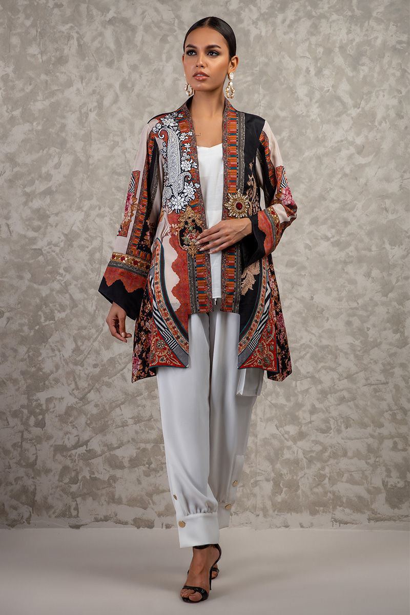 Front open jacket print on silk fabric design inspired by Kashmiri Ornaments intricate hand embroidered black and white Kashmiri paisley motif enhanced with white pearls appliqued on the jacket embellished motifs appliqued on the jacket handmade embroidered lace on the sleeves. The outfit is paired with plain white inner and can be paired with solid matching pants or pants as shown in the picture.