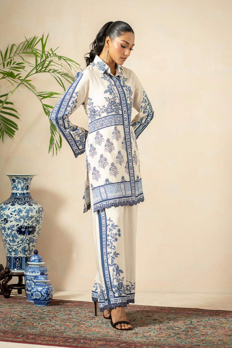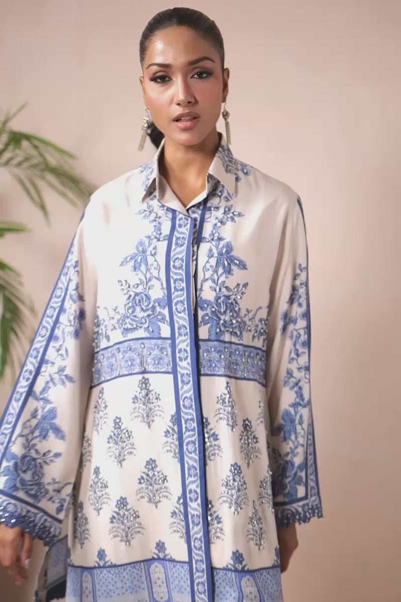An elegant ivory ensemble adorned with blue porcelain-inspired motifs, intricate borders, and lace-finished hems — a timeless statement of refined sophistication. This exquisite ivory and blue set is an artistic masterpiece inspired by classic porcelain art — a hallmark of Shamaeel Ansari’s design language where heritage meets modern elegance. The shirt features a structured shirt collar, button-down front, and wide sleeves enhanced with detailed border placement and delicate lace trims. The intricate porcelain-style motifs, rendered in varying shades of blue and cobalt, create a harmonious and visually striking composition. Paired with matching ivory printed pants displaying coordinated border and floral artwork, the ensemble flows effortlessly with a soft, graceful silhouette. The lace finishing at the hem adds a touch of femininity and refinement, elevating the look from luxury daywear to understated luxury pret. Perfect for lunches, art-inspired events, resort evenings, and sophisticated gatherings.
