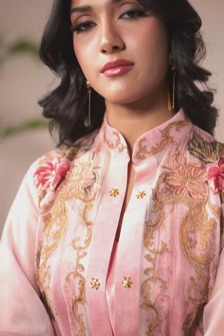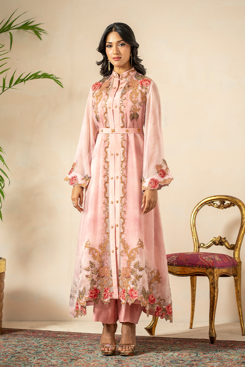 A soft blush-pink long gown adorned with intricate threadwork, floral accents, and delicately embellished details, a signature Shamaeel ensemble celebrating femininity, grace, and timeless artistry. This exquisite blush-rose long gown is crafted in Shamaeel’s signature aesthetic, blending refined elegance with artisanal craftsmanship. The silhouette features a structured front button panel, a tapered belt to enhance the waist, and sheer sleeves that add effortless fluidity to the look. Detailed floral embroideries in rose, gold, and sage tones run along the neckline, front, sleeves, and hem, creating a beautifully balanced composition that feels luxurious yet wearable. The gown is paired with solid straight pants for a polished, sophisticated finish. Perfect for luncheons, soirées, festive gatherings, and intimate celebrations — this ensemble embodies Shamaeel’s classic blend of culture, craft, and couture.