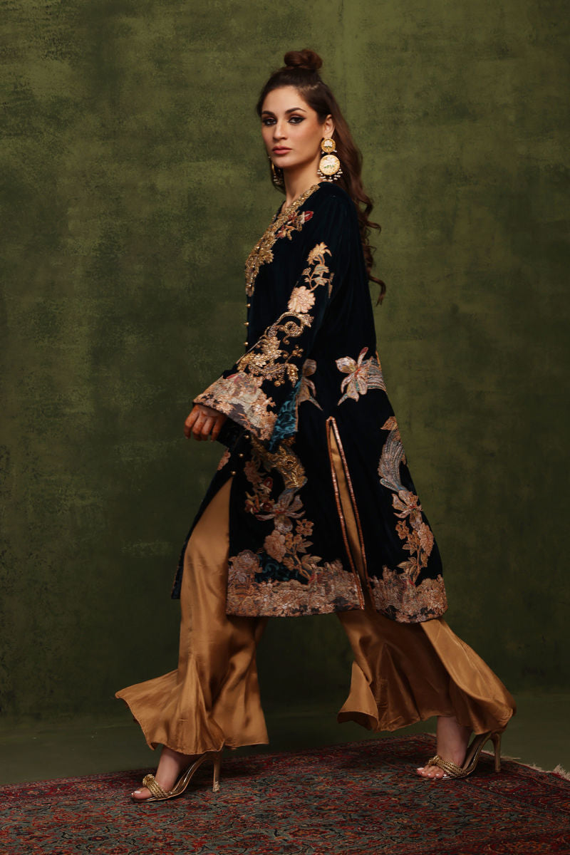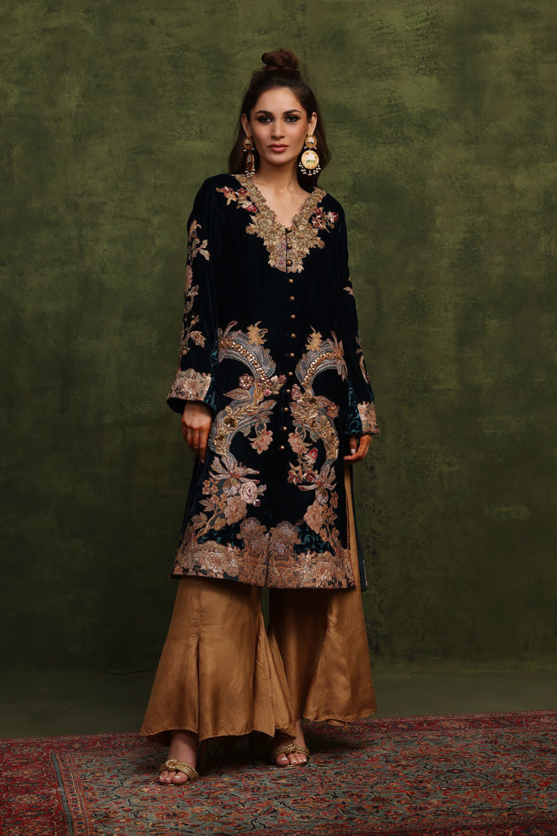 The velvet jacket style tunic provides a sleek appearance. The neckline of the jacket is adorned with intricate detailing crafted with resham, dabka, and antique tilla work.