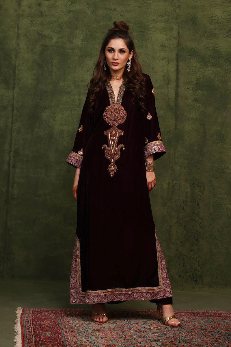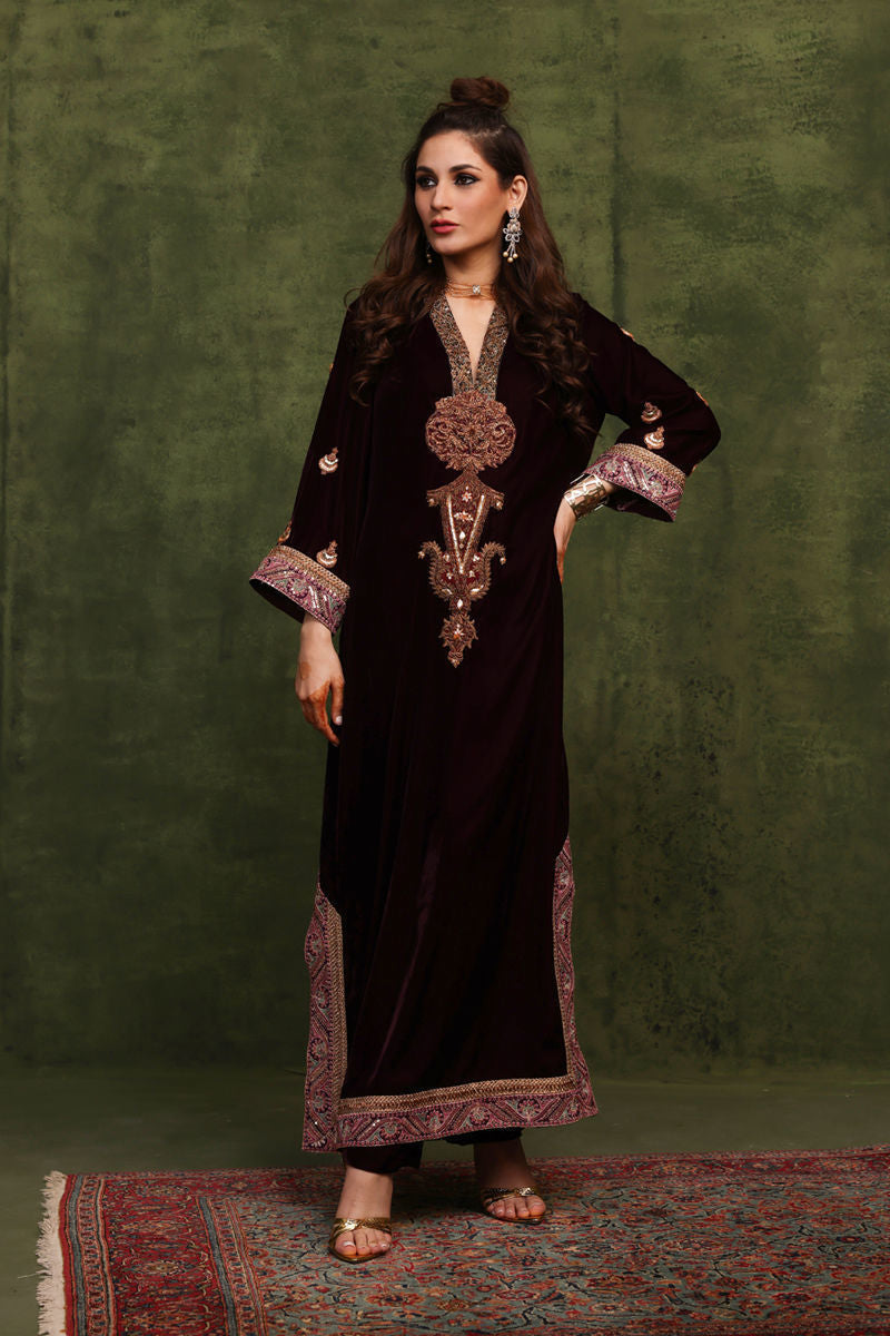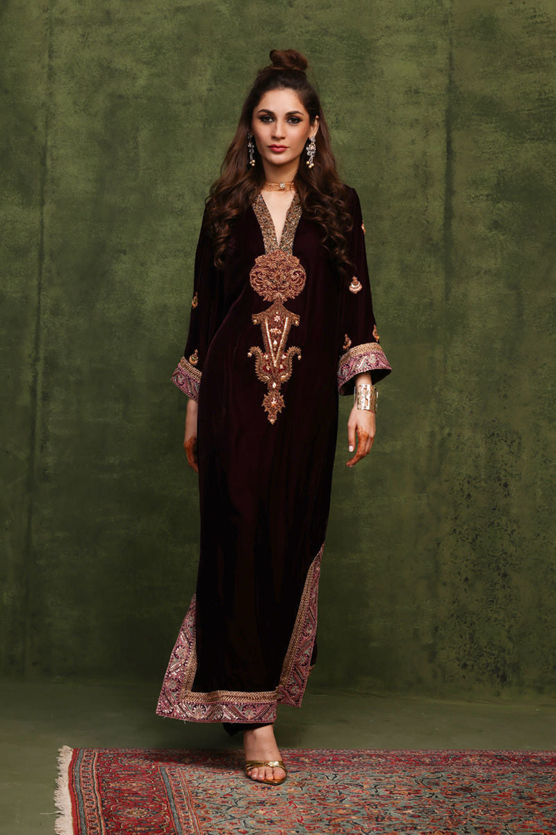 A velvet Kaftaan style silhouette in an antiquity color sounds absolutely luxurious! The Zardosi work on the neckline, along with handwork, tilla, and dabka, would create such intricate detailing comes with straight pant. The signature Shamaeel look is achieved by draping the dupatta with a belt, adding a sophisticated touch to the ensemble.