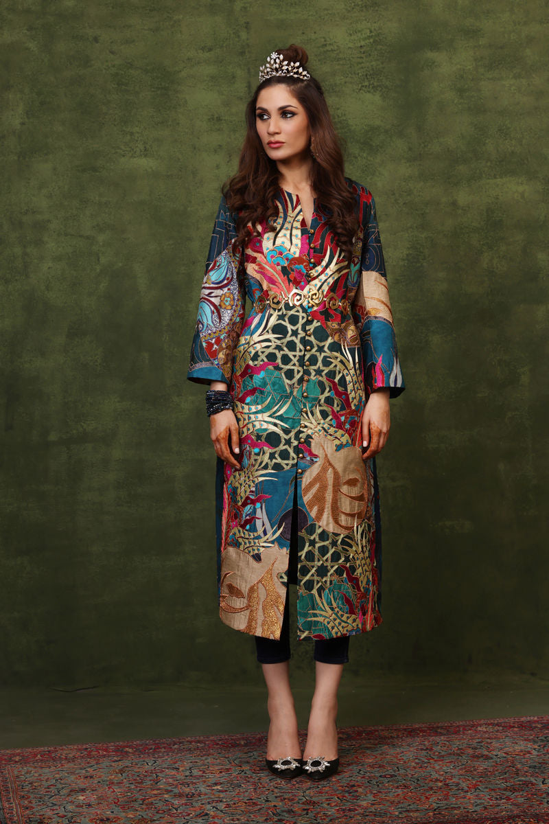 Long front open jacket, Beautiful Turkish inspired print on silk fabric, Embroidered Jacket & print is enhanced with gorgeous resham work. Golden fabric applique work on the print. Comes with inner.