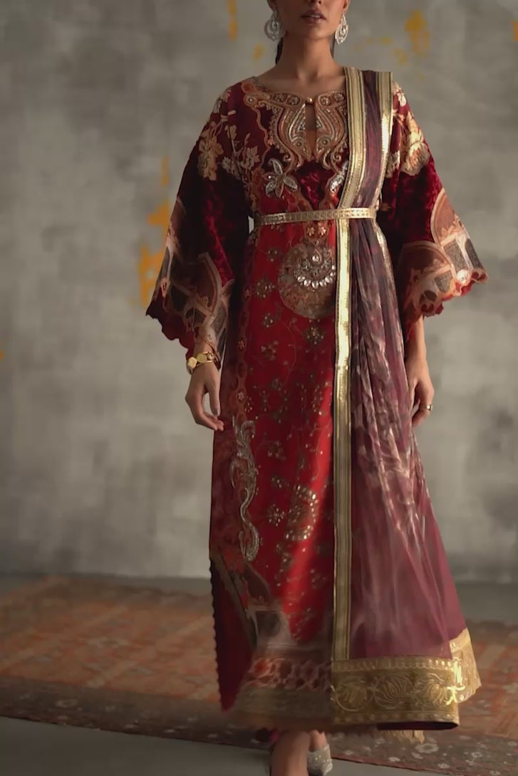 Traditional long straight shirt, digital print on silk fabric, mughal era inspired motifs. Shirt print is enhanced with golden tila thread, beautiful intricate zardozi work on the shirt. Dark maroon palachi fabric appliqued on the neckline, print is appliqued on dark maroon palachi fabric on the sleeves.shirt is finished with intricate handcrafted tila thread lace.This shirt is paired with pant. Can be paired with net Dupatta finished 5" embridered border on pallu and 1" embroidered border on 2-sided.