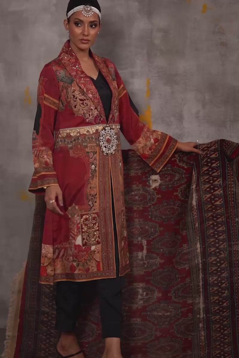 This exquisite jacket showcases a stunning fusion of traditional Oriental design and modern elegance in digital printed silk fabric. The front is embellished with combination of zari and resham embroidery. A central feature of the jacket is the thoughtfully designed opening adorned with an embellished motif. It comes with inner. Comes with straight pant to complete the look. Can be made inner & Pant in any Colour.
