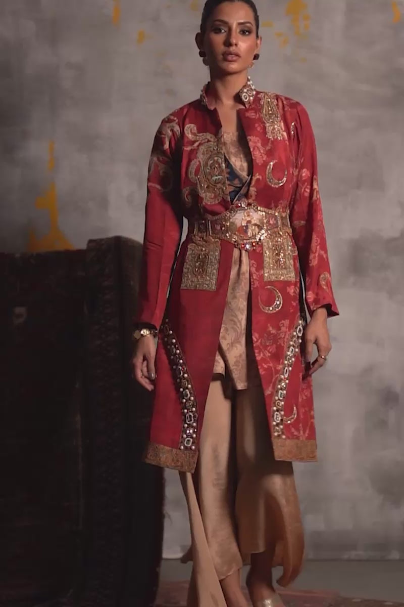 Royal red jacket inspired from the Victorian era, crafted from silk fabric features hand touching in front with dabka,pearls and chann, resham, zari work. To emphasize the cut the bottom of the jacket is embellished with an opulent arrangement of pearls and stones. A meticulously embellished belt serves to highlight the waist, adding a touch of glamour to the overall design. The inner lining of the jacket is adorned with a digital print, showcasing a subtle hint of royal blue that elegantly peeks through. Paired with draped pant gives the modern elegance.