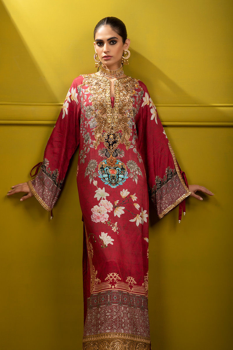 Relaxed original Shamaeel silhouette floral and geometrical print on silk fabric detailed handcrafted neckline designed using antique gold dapka, nakshi, sequence, gota, pearls, tila thread and antique maroon stones and finished with handmade antique tila thread and sequence lace.