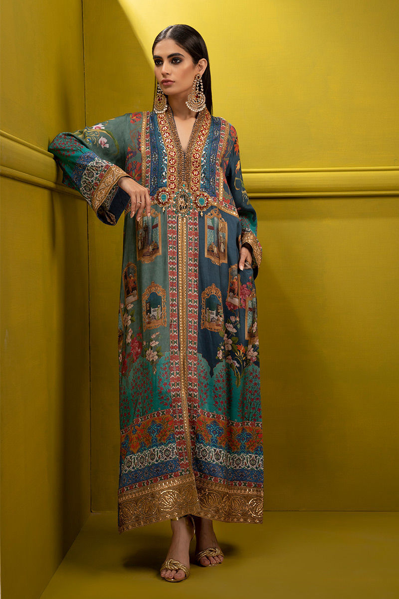 Beautiful easy breezy original Shamaeel silhouette traditional colour palette richly detailed design featuring a blend of floral and geometrical mughal inspired motifs printed on silk fabric beautifully handcrafted galla patti made with antique gold dapka, sequence, gota work, pearls, resham thread and tila thread and finished with handmade lace made with antique tila thread and sequence.
