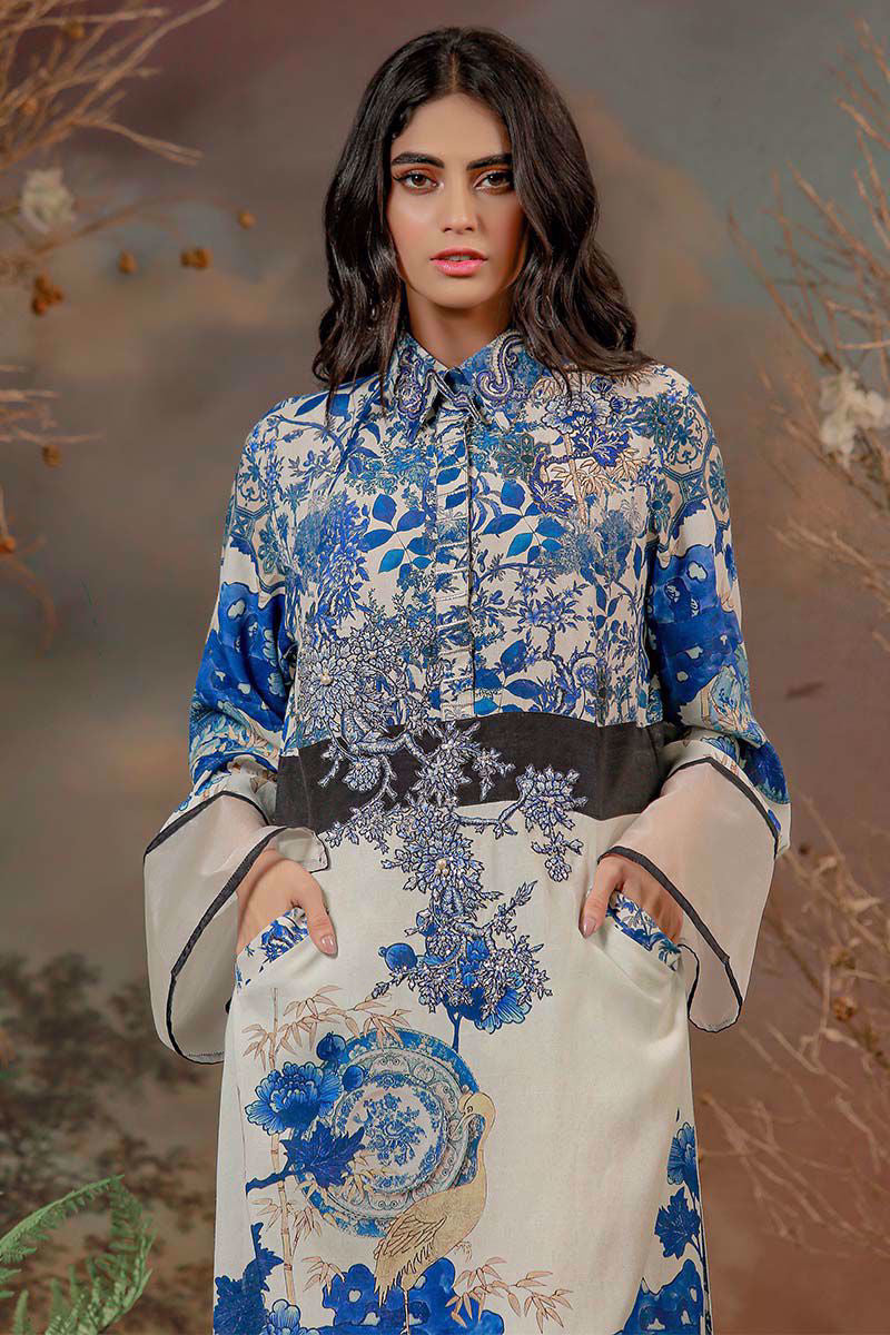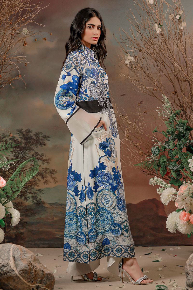 A beautiful festive ensemble stitched in an original Shamaeel silhouette. features beautiful botanical digital print in shades of blues on an ivory textural silk fabric. Accompanied by delicate hand crafted embroideries constructed with intricate silver zardozi and resham thread work.