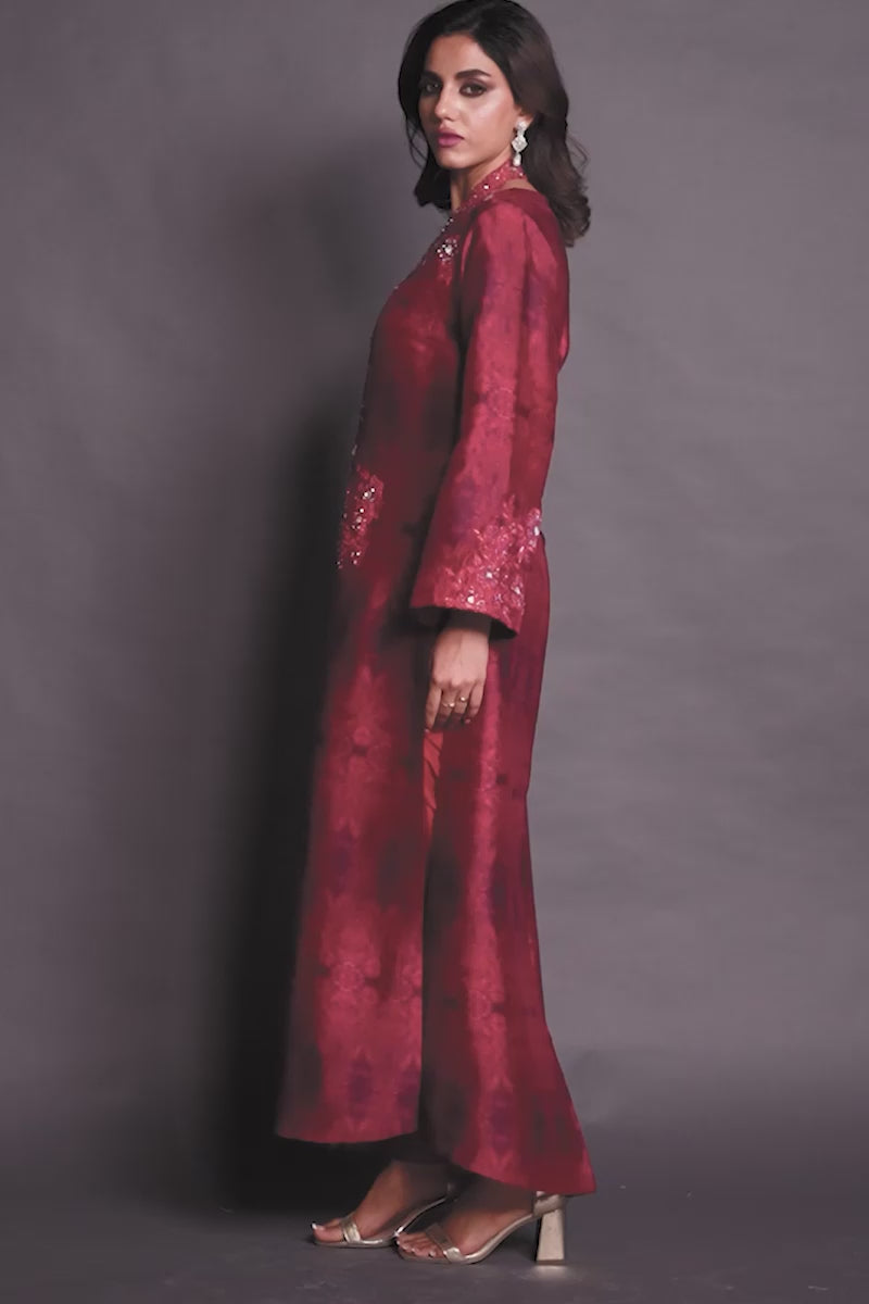 This stunning deep red ensemble exudes timeless elegance with its rich fabric and intricate embellishments. The long, straight-cut silhouette is adorned with delicate embroidery and shimmering accents around the neckline and bodice, adding a touch of regal charm. The subtle patterns woven throughout the fabric enhance its luxurious appeal, making it a perfect choice for formal occasions or festive gatherings.