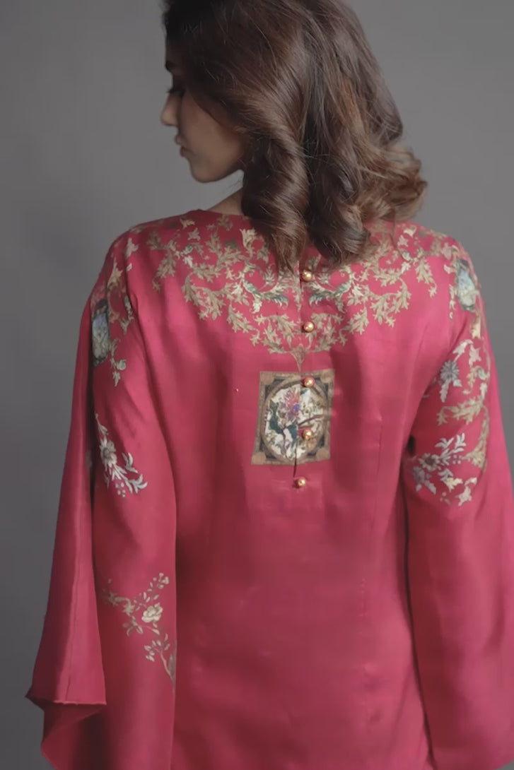 This bold and elegant red ensemble is a perfect blend of contemporary style and traditional craftsmanship. The statement top features a relaxed silhouette with dramatic wide sleeves, adorned with intricate gold embroidery and delicate embellishments. The regal motifs and hand-stitched details enhance the luxurious appeal of the outfit.