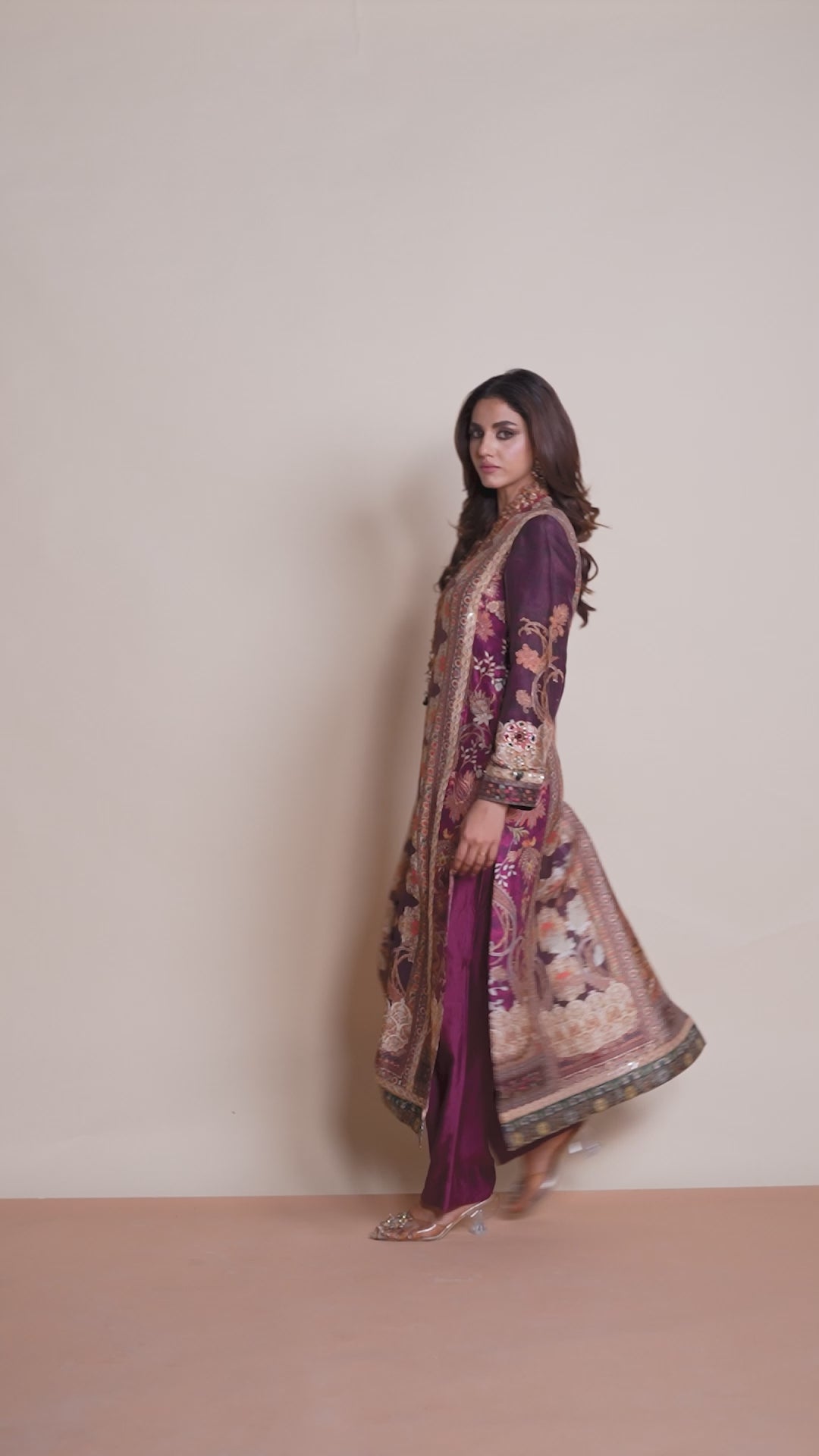 A simple, straight silhouette shirt with a beautiful print on silk fabric, inspired by Mughal ornaments. It features a delicate handcrafted neckline, created with resham thread, antique tila thread, and zardozi work, with antique gold tila thread enhancing the print. Comes with pants.