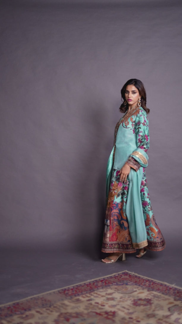 This exquisite aqua ensemble is a stunning fusion of traditional artistry and modern elegance. The front-open long jacket, in a mesmerizing aqua blue base, is adorned with intricate floral and Mughal-inspired prints in vibrant hues of red, gold, and deep blue. The rich embroidery, delicate sequin work, and ornate embellishments along the neckline and front panel add a regal touch.