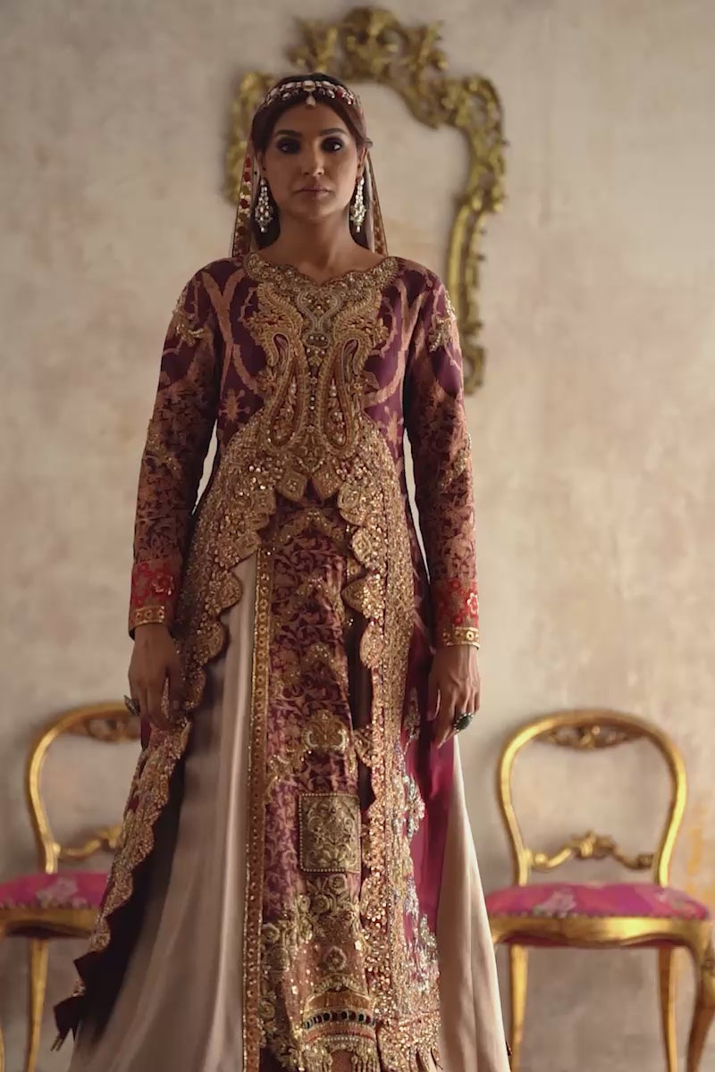 Pure printed silk outfit inspired by Mughal opulence, elevated by in-house embroidery featuring Nakshi, Dabka, and Zardozi work, exuding timeless elegance.