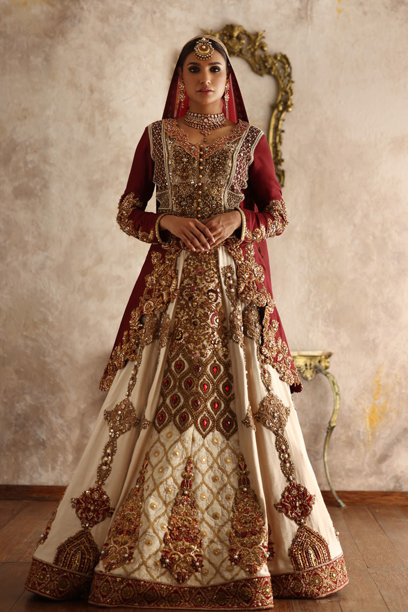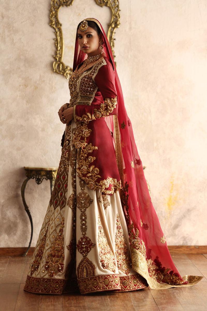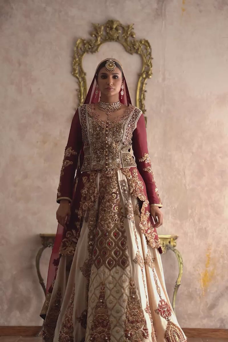Mughal majesty meets modern luxury: Exquisite bridal outfit crafted from pure printed silk, intricately enhanced with Nakshi, Dabka, and Zardozi embroidery, perfect for the discerning bride.