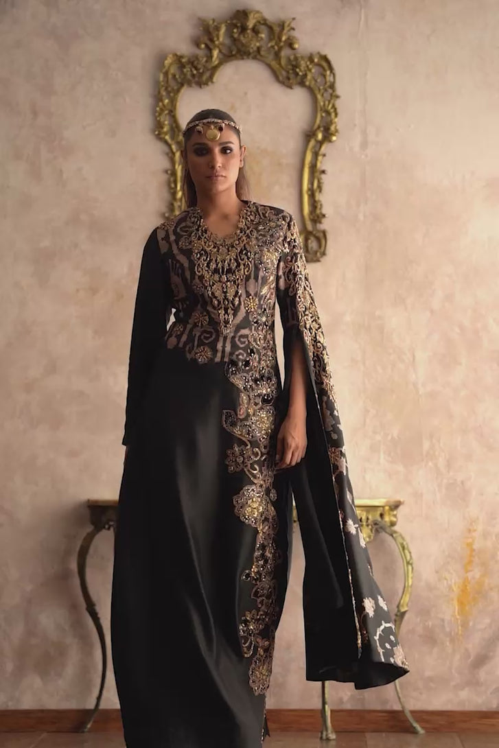 Ottoman-inspired jacket with bellbottom and inner, printed on silk, showcasing stunning embroidered floral bunches and hand-touching details, celebrating the beauty of heritage fashion.
