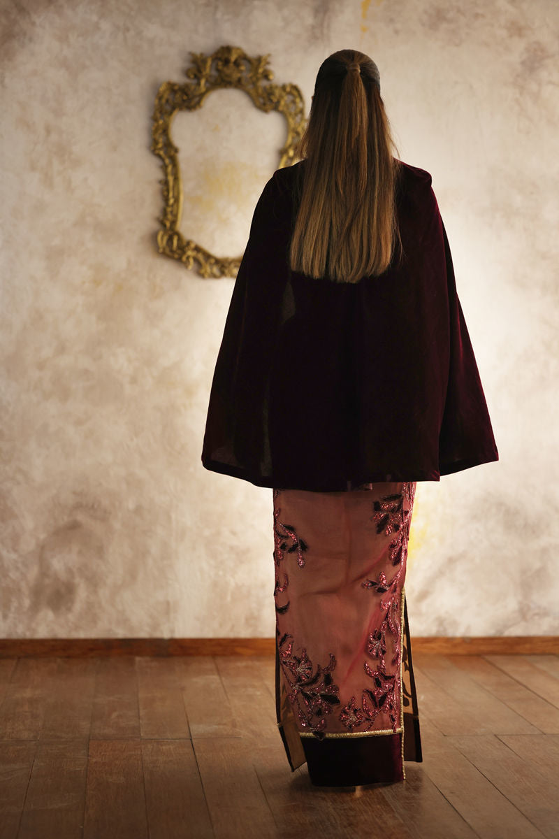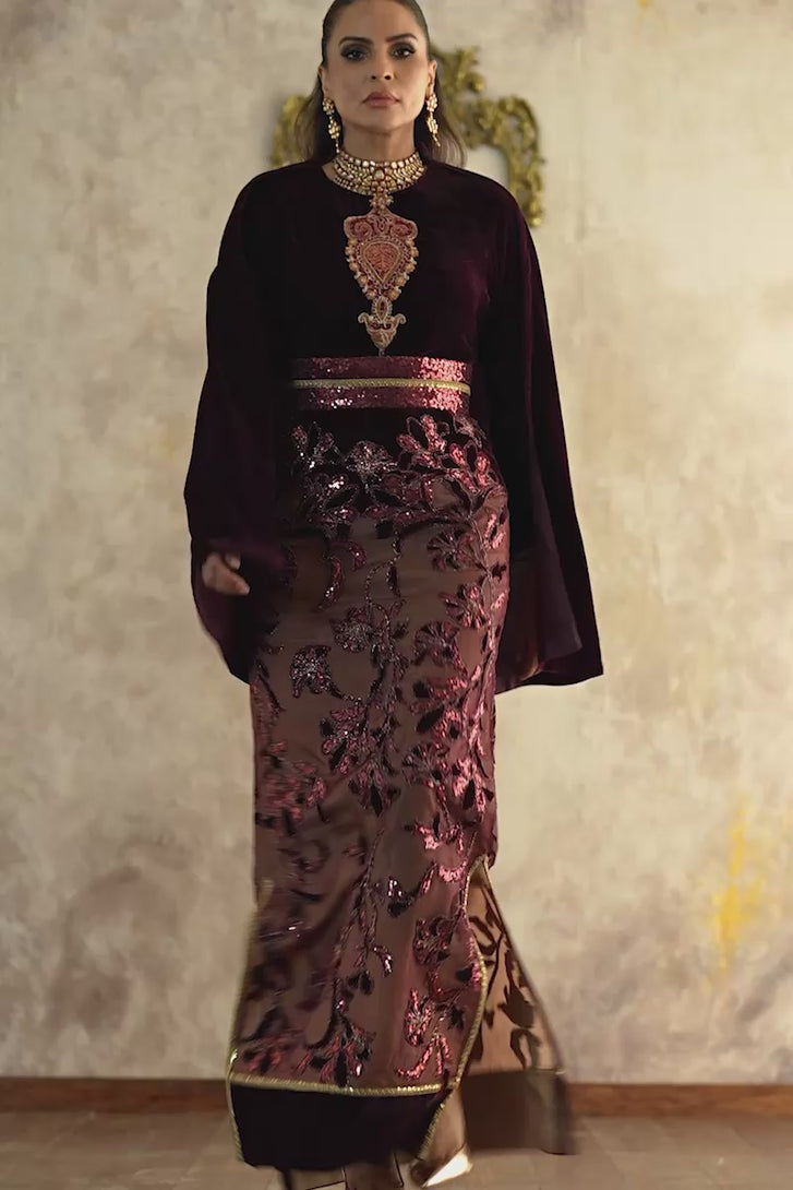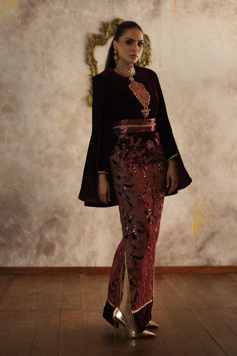 Stunning velvet dress with cape, featuring intricate organza and sequence appliques, beautifully complemented by embroidered floral bunches, and finished with a matching belt for a majestic look.