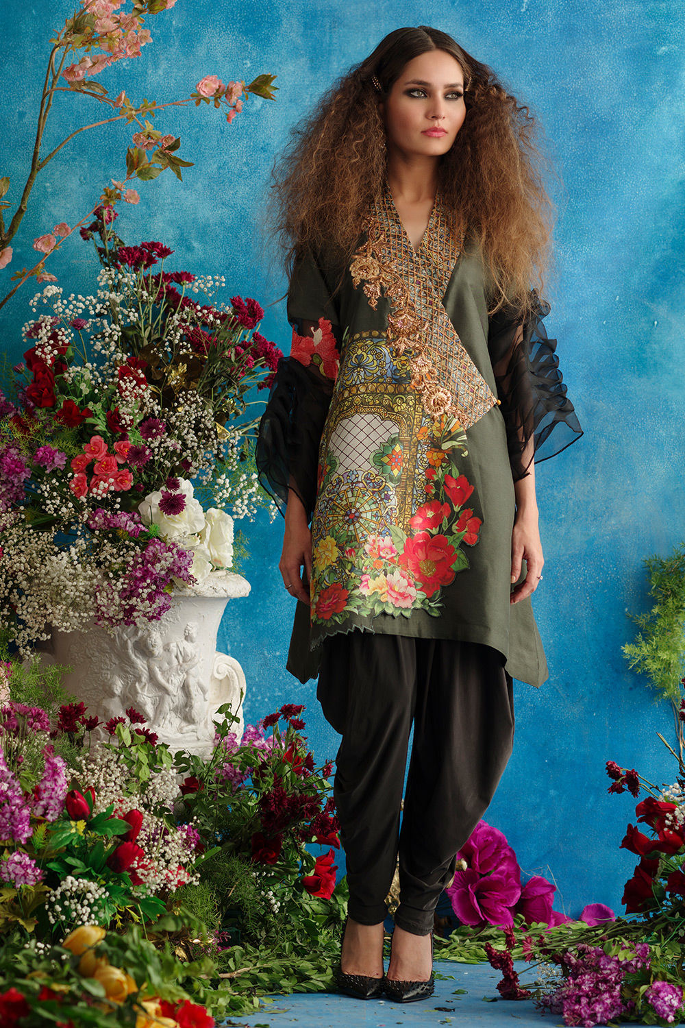 Cross wrap tunic in silk digital print cross neck worked in gold crisscross with gold hand worked stem of flowers and leaves overlapping the right hand side cross wrap sleeves half in silk and half in roushed organza with embroidered thread motif on right sleeve.