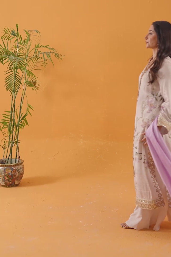 Elegant textured printed mute pinkish straight-cut embroidered kurta with intricate handwork detailing on the neckline finished with a motif, a box above the hem enhanced with the kaam of zardozi. Sleeves finished with beautiful crafted lace, and hem. Paired with loose pastel trousers and a soft sheer lilac medium silk dupatta, creating a graceful look ideal for festive gatherings, evening summer parties and semi-formal occasions.