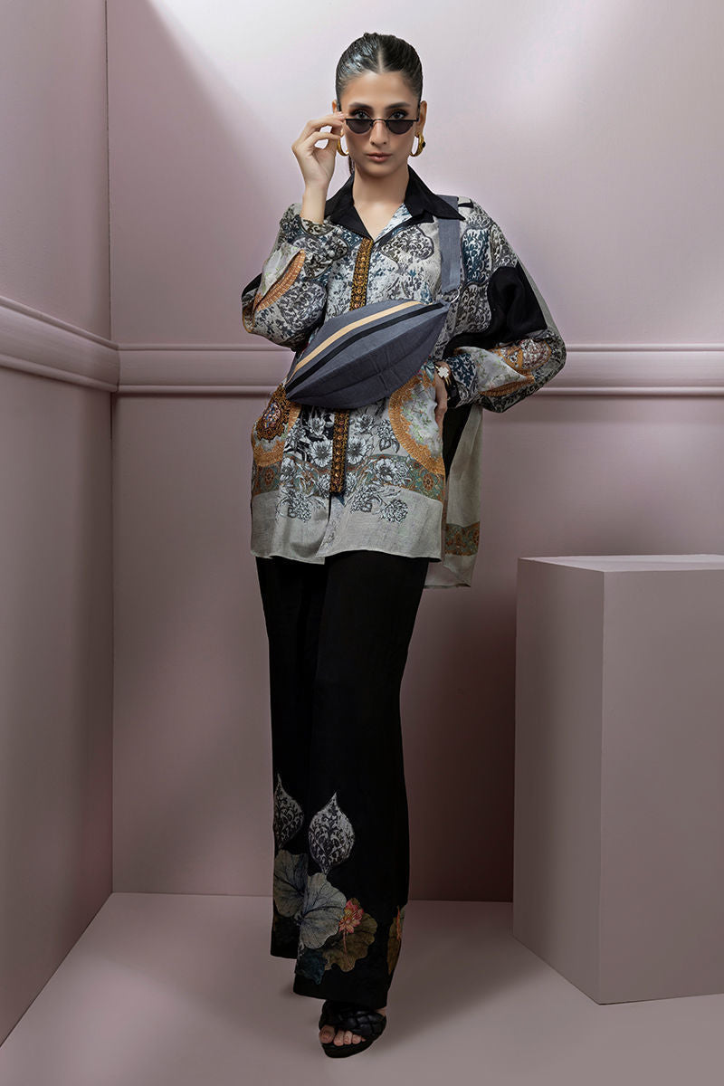 V-neck buckle shirt styled with printed pants. Shirt has detailed thread floral embroidery on centre of shirt with zari hint. Looks best for an official event, evening parties, local and international wear. Bag can be added seperately as per customer request.