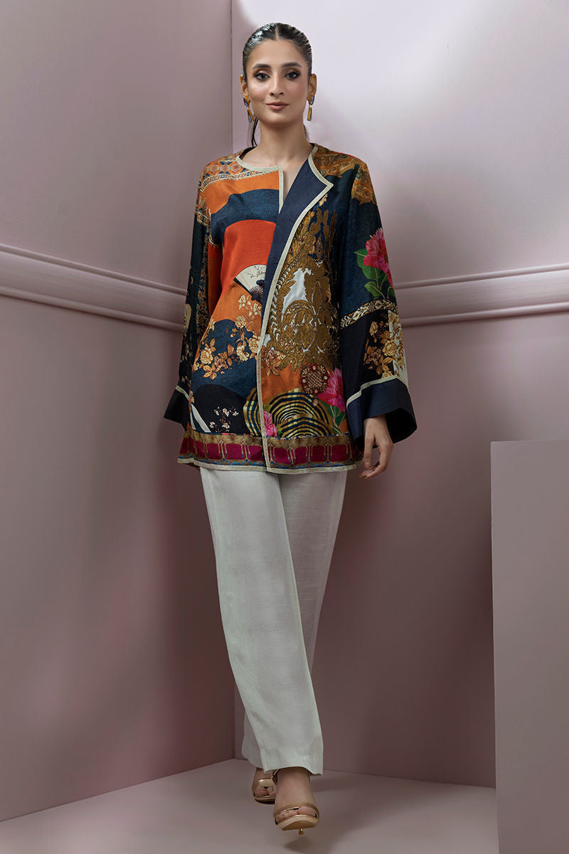 Funmood is the new style. The structured jacket style top in bright prints of blue, rust and ivory. Embellished with antique gold embroidery and handworked jewel motifs paired with ivory pants. Comes with and without the belt as per customers requirement.