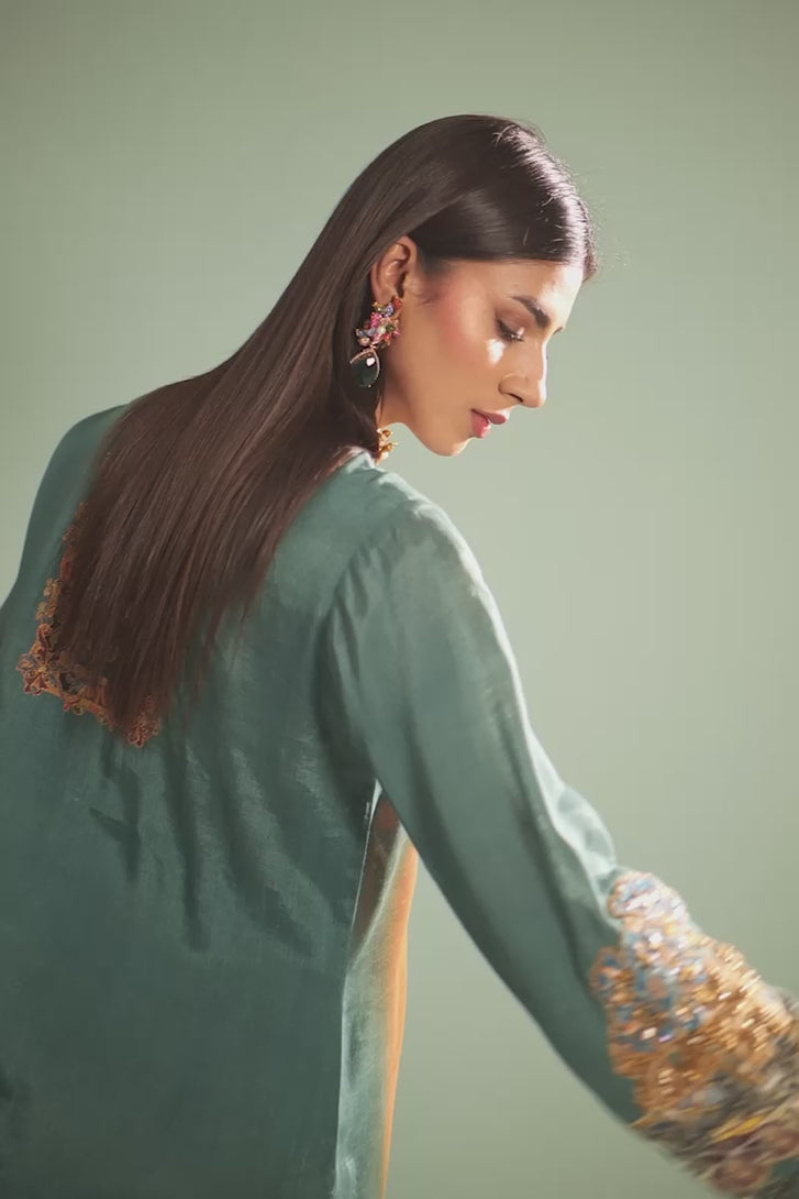 This striking outfit features a beautifully blended emerald-to-rust gradient, creating a warm and regal canvas for its intricate digital artwork. The V-neckline is framed with ornate detailing, while the sleeves are adorned with elaborate baroque-inspired motifs that elevate the elegance of the silhouette. The front of the kurta showcases grand, tapestry-like patterns, including architectural frames, floral scrolls, and ornate emblems, all meticulously illustrated for a luxurious finish. The hem is richly decorated with detailed borders, adding depth and sophistication. Paired with rust-toned trousers, this ensemble exudes a refined, artistic charm, perfect for festive gatherings, statement occasions, or upscale daywear kitty parties.