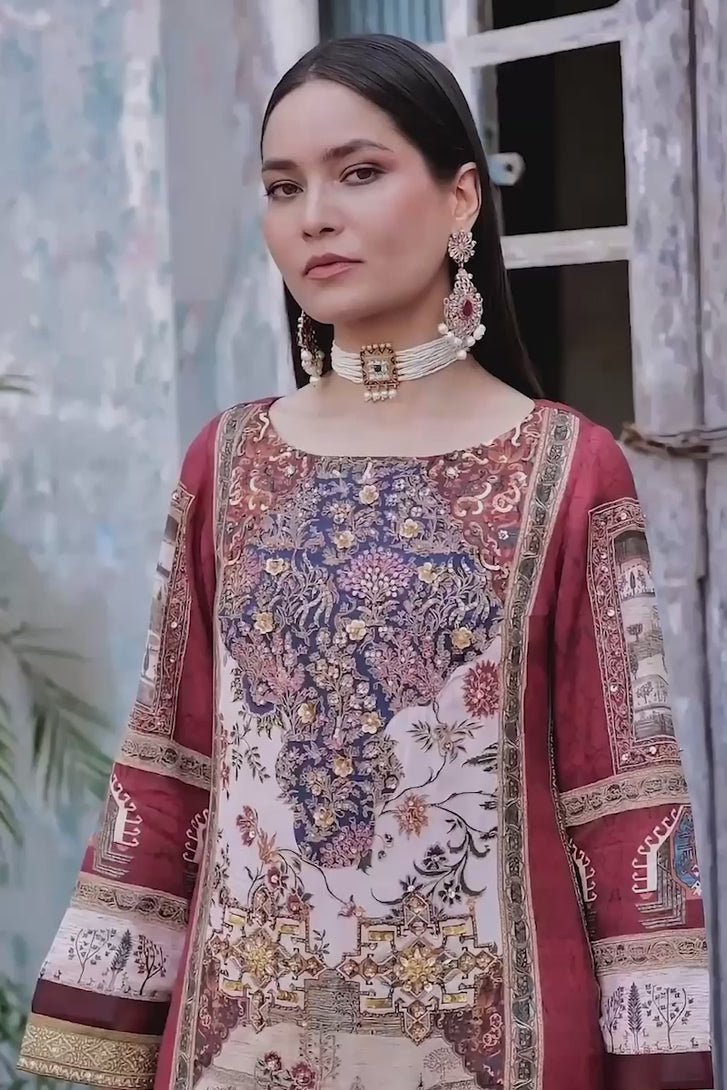 A timeless full silk ensemble that celebrates classical artistry and refined craftsmanship. The silk shirt is adorned with intricate, tapestry-inspired motifs that create a rich visual narrative, balanced beautifully with a fluid silk pant for effortless elegance. The look is completed with a matching silk dupatta, adding depth and graceful movement to the silhouette. Designed for women who value heritage, detail, and quiet luxury, this ensemble is perfect for festive occasions and elegant cultural gatherings.