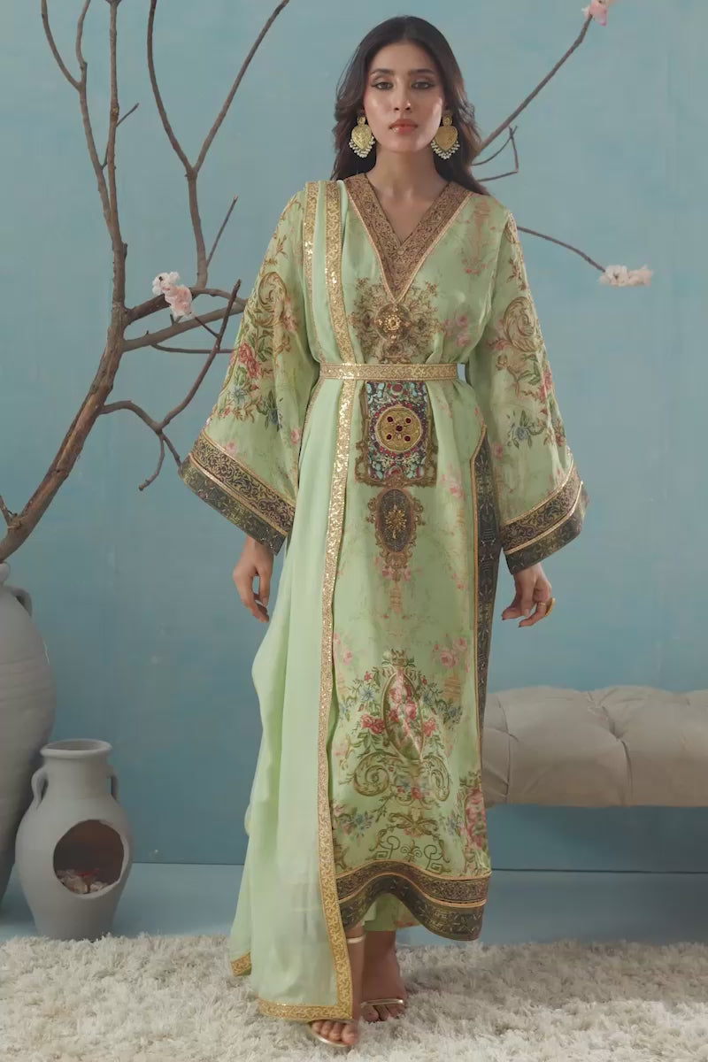A straight, long shirt print on sheesha silk, adorned with baroque style prints featuring soft pink flowers and antique ornamental motifs outlined in golden thread and enhanced with hand done detailing like sequins, lace, and touch ups around the neckline. The outfit is finished with gold lace, it comes with a straight cut printed pants in matching fabric creating a polished, Shamaeel's signature blend of vintage elegance and refined craftsmanship. Dupatta can be added seperately to finish the look.