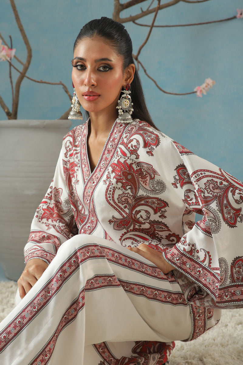 Red-on-white short jacket set featuring vibrant chintz prints and intricate red detailing, finished with beautifully detailed borders for a striking look.