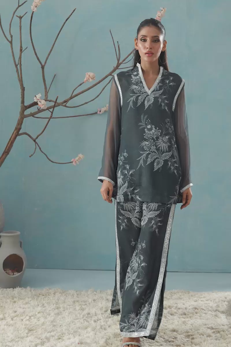 Blue matching separate printed outfit, beautifully detailed with silver lace accents on the borders and neckline.