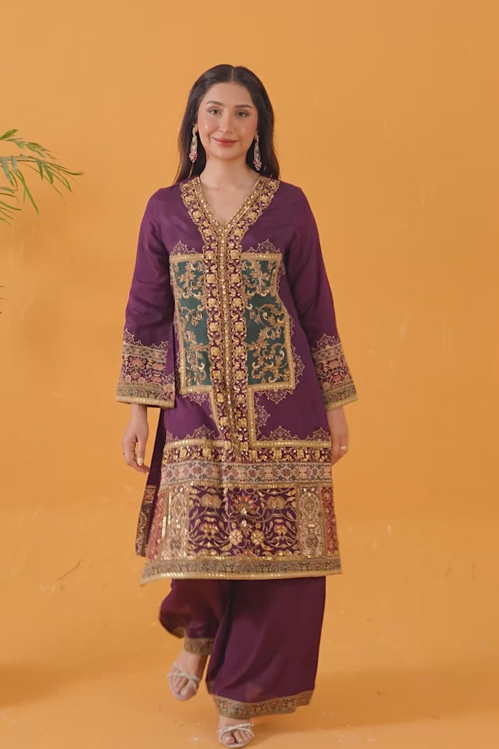 This luxury ensemble features a deep burgundy color palette with a heavily embellished, traditional aesthetic. The shirt is densely adorned with gold tilla embroidery and intricate hand-embellishments which is crafted with dabka, tilla, sitara, sequence and moti throughout the front panel. It features a prominent, rectangular-style central motif and ornate patterns along the sleeves and bottom hem. The ensemble is crafted from a refined finish suitable for festive wear. It is paired with a matching solid-colored dupatta that is finished with a gold tilla lace border along the edges. The shirt is complemented by matching wide-leg trousers that features a delicate print at the bottom, creating a sophisticated and cohesive look.