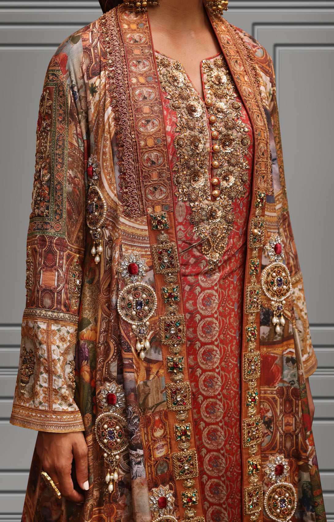 Classic representation of new classicism asthetics which involves harmony, clarity, universality and idealism. It is just not any outfit but a representation of attitude and regality drapped in symmetry maintaining the simplicity of line of colors and geometric shapes. Its an oath to an antiquity and craftmen ship and visual story telling in Shamaeel signature rich details and embroidery inspired by geometric pine jwellery. A long jacket paired with floor length inner with galla kaam on it. You can order through website or call or have an appointment with Shamaeel to customize colors of your choice.