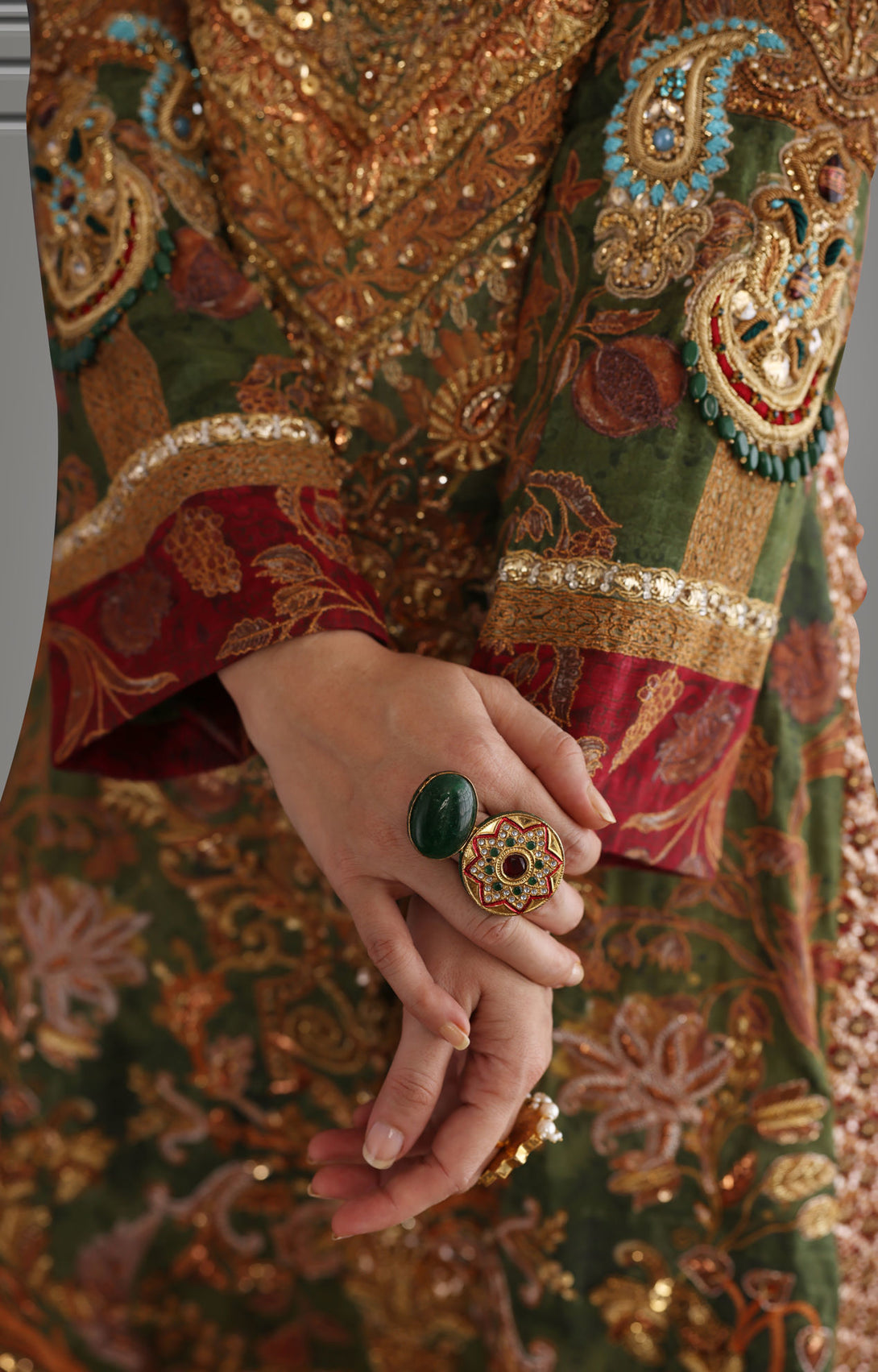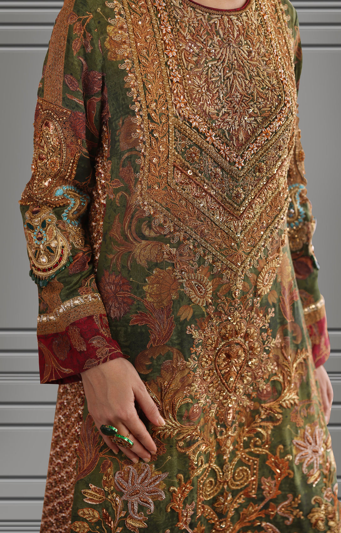 Straight long traditional kurta beautiful floral digital print on silk fabric fully hand embellished front created with antique gold dapka, naqshi, sequins, pearls and tila thread. Rich maroon border created with heavy zardozi work. The luxurious outfit is paired with beautiful maroon sharara and printed net duppatta. You can order through website or call or have an appointment with Shamaeel to customize colors of your choice.