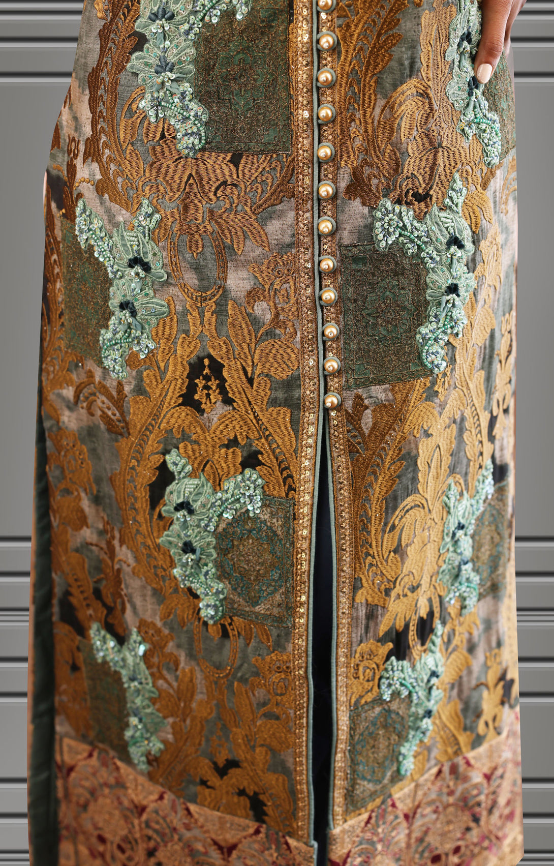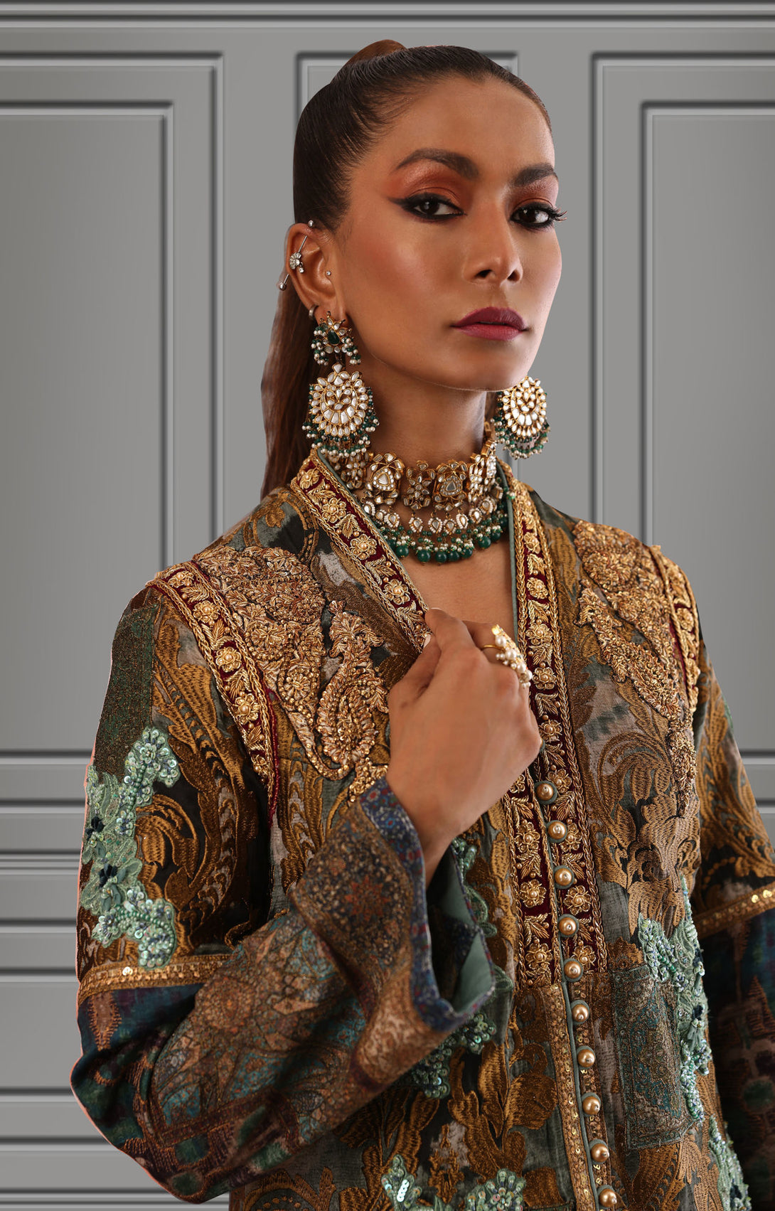 Straight long silhouette ikat inspired digital print on silk fabric overall bold antique tila thread embroidery on the print delicate dull ferozi floral motifs made with resham thread and sequence intricate hand embellished galla and arm hole patti finished with elegant resham thread border and paired with plain blue straight pants. You can order through website or call or have an appointment with Shamaeel to customize colors of your choice.