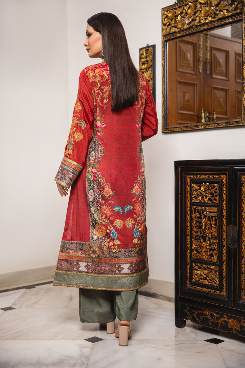 Bright hues of burnt orange and red printed in silk is the majestic beauty for festive season. Drawing inspiration from Antique Royal Attire, the design incorporates intricate details and embellishments that add an aura of luxury creating a mesmerizing tapestry of ornate patterns and motifs. Styled with delicate gota details in neckline and handwork essence in front. Gives you a complete look when paired with gorgeous printed stole and pants.