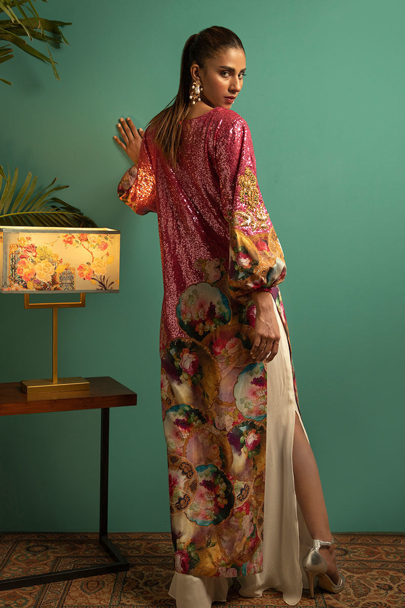 Modern yet elegant relaxed silhouette beautifully printed on silk fabric with slit on one side. 3D handmade embroidery of marori, zardozi and stone work on motifs. Sequins work on front and sleeves.