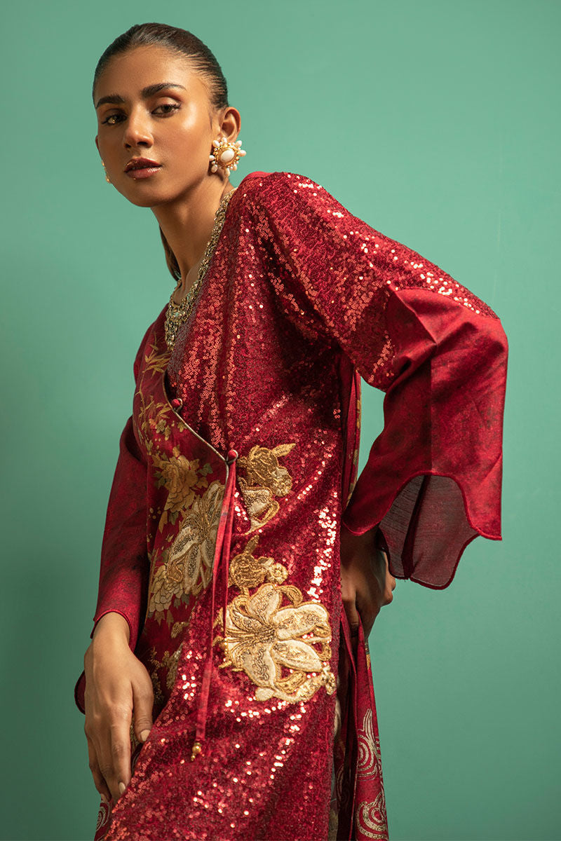 Digitally printed modern silk wrap art by Japenese and oriental prints. 3D hand made neck embellishment. Gold tilla, zardozi and dabka work beautifully embellished. Sequins work on front and left sleeve.
