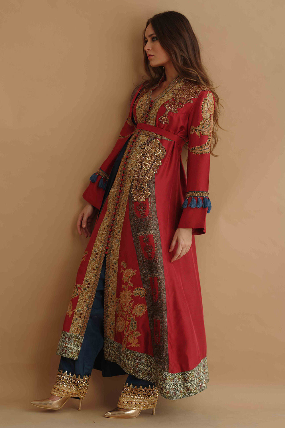 Digitally printed silk inspired by mughal carpet prints long front open coat; heavily hand embellished motifs worked in zardozi with antique sequins, gota work and gold tilla outlines enhancing prints on front and sleeves. Edged with printed borders and hand worked antique pattis. Can be paired with digitally printed stole in silk with silk backing and shalwar. And an optional fabric belt given for the youth without any loop on outfit.