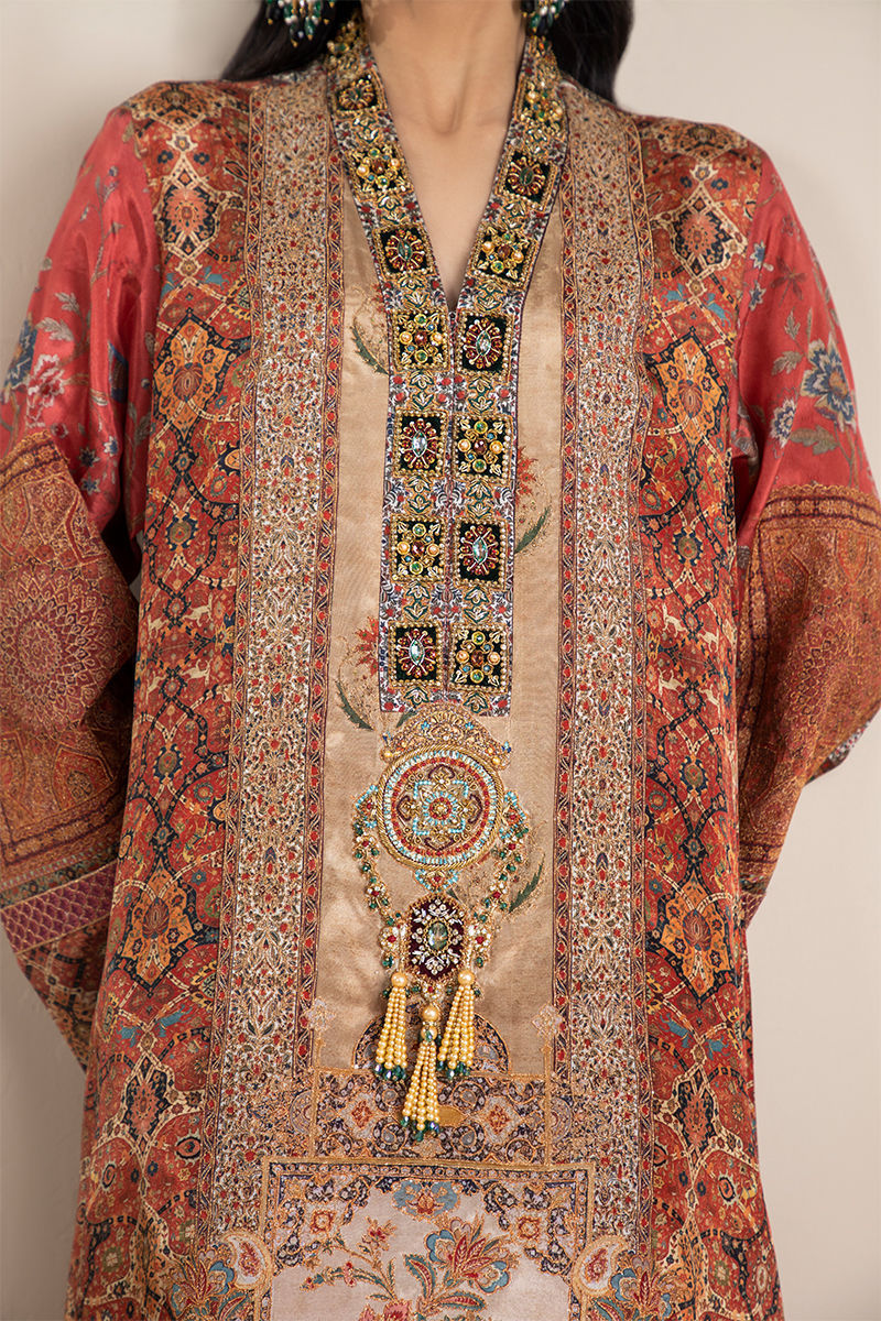 Straight long shirt silhouette with round border Kashmiri ornaments inspired print on silk fabric front galla print enhanced with gold tila thread embroidery heavy embellished galla patti and motif created with beautiful delicate zardozi work with peal tassels and delicate handcrafted resham thread lace on the sleeves. Can be paired with silk straight pants.