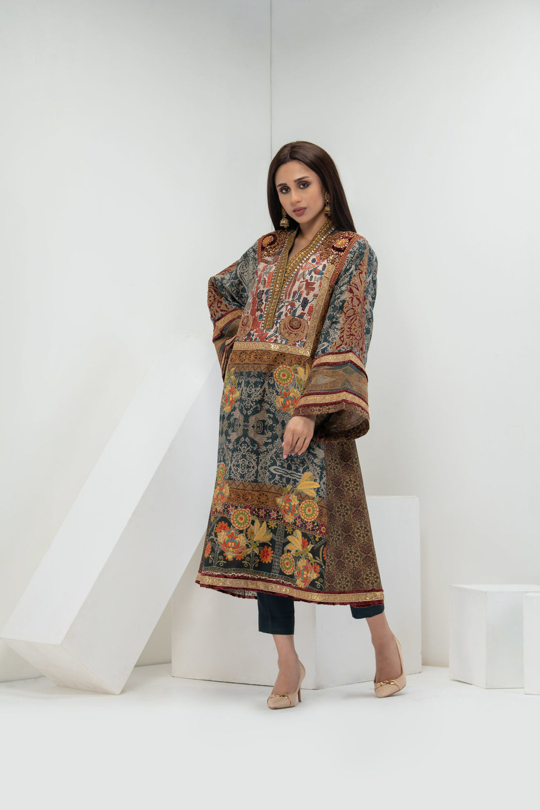 A-line kali shirt inspired by antique Ottoman carpets kundan and gold zari tilpat on the neckline kasab and bead worked border antique colored pati on velvet chakras on the shoulder intricate gold outlining on the front jewel embellished with zardozi motif on the front. Can be paired with silk pants.