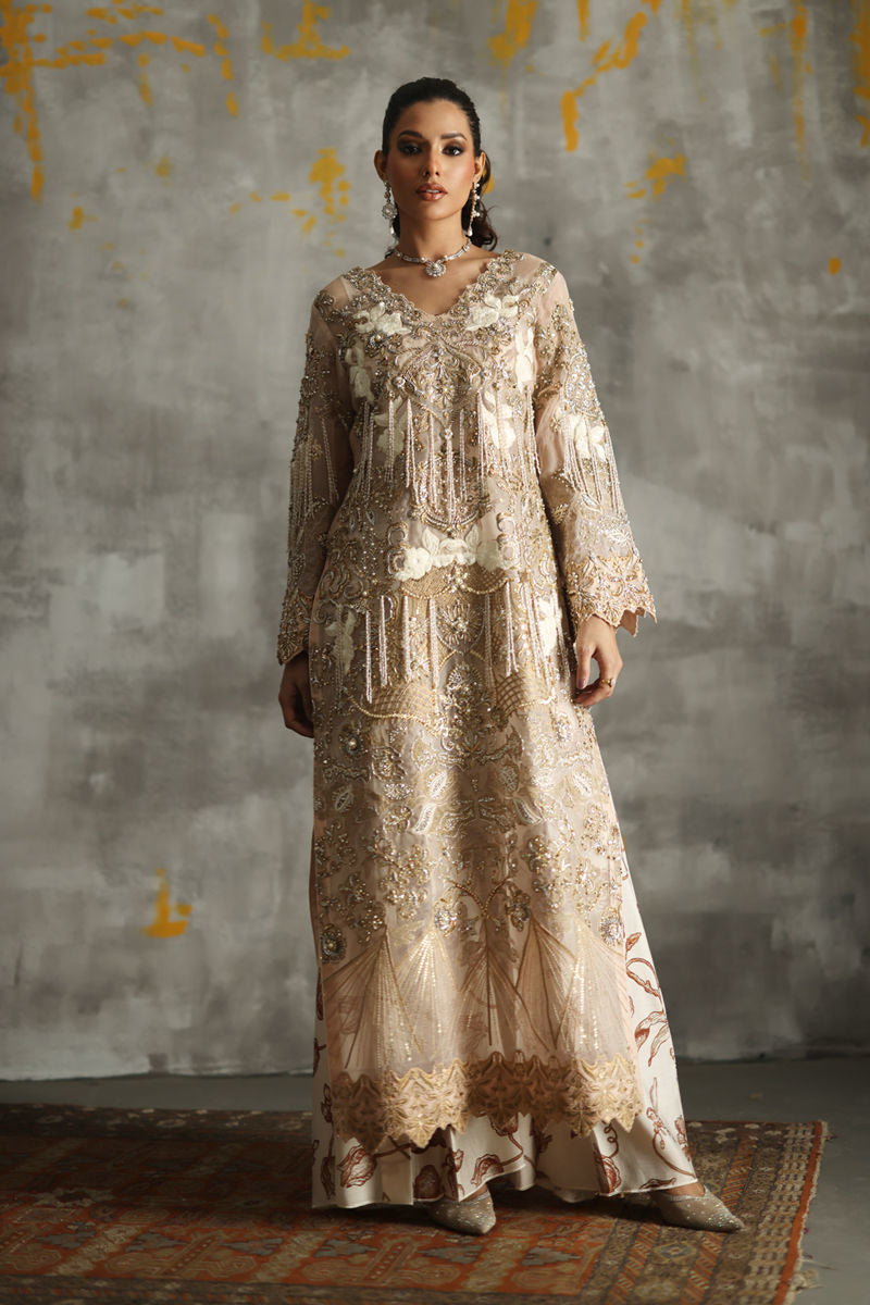 Experience the allure of the Belle Époque era through an exquisite ensemble. Revel in the elegance of a long organza silhouette adorned with intricate embroidery, featuring a masterful blend of zardozi, resham, gold and silver zari, pearls, and stones. The shirt is adorned with a touch of chann, while the front is gracefully tasseled with pearls and stones for a mesmerizing movement. The sleeves has zari outlines & pearls strings for added refinement. Inside, a digital printed silk slip provides a subtle peek-a-boo effect, complemented by a flared silk trouser with matching digital prints.