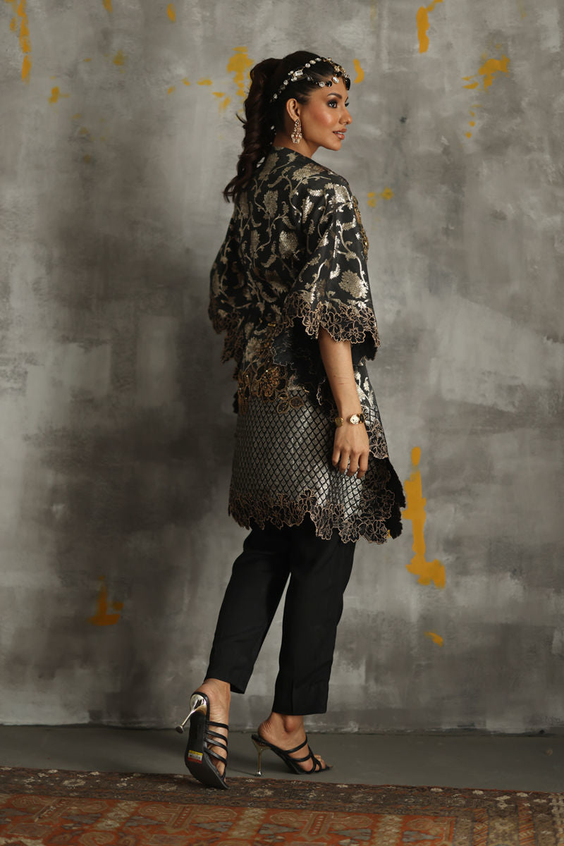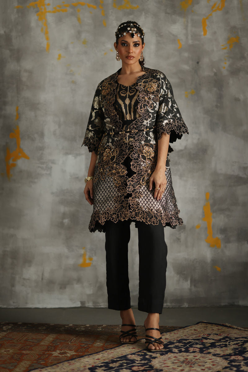 An ethereally beautiful black ensemble, featuring a front open style adorned with gold threads, resham, stones, and pearls. The front is intricately embellished with floral borders in black and gold embroidery. The inside slip is printed and layered with a jacket, complemented by a tied belt for a stylish ensemble. Paired with black trouser.