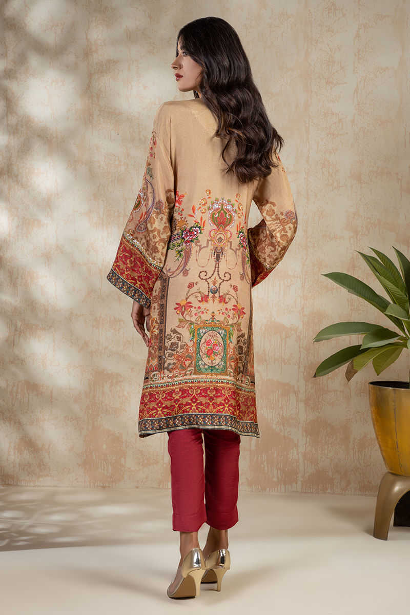 Elevate your formal wear experience with this digital printed shirt features a rich tapestry of intricate patterns and artistry of Persian design. It has contemporary drop-shoulder cut, giving it a relaxed yet sophisticated silhouette. Neckline enhanced with zari, dabka and some gota work, front is fully worked with handwork tilla, pearls and sitara. Sleeve border is also enhaced with worked lace.