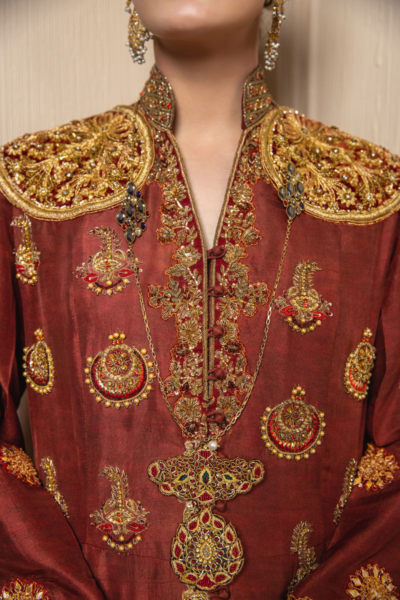Unveiling regal splendor, this front open style lehenga in a captivating burnt maroon hue embodies the essence of Mughal and Moorish grandeur. Crafted with handwork motifs in zardozi, dabka, sitara and chun and some essential stones, this ensemble seamlessly blends history and contemporary fashion, leaving an indelible impression of majestic allure.