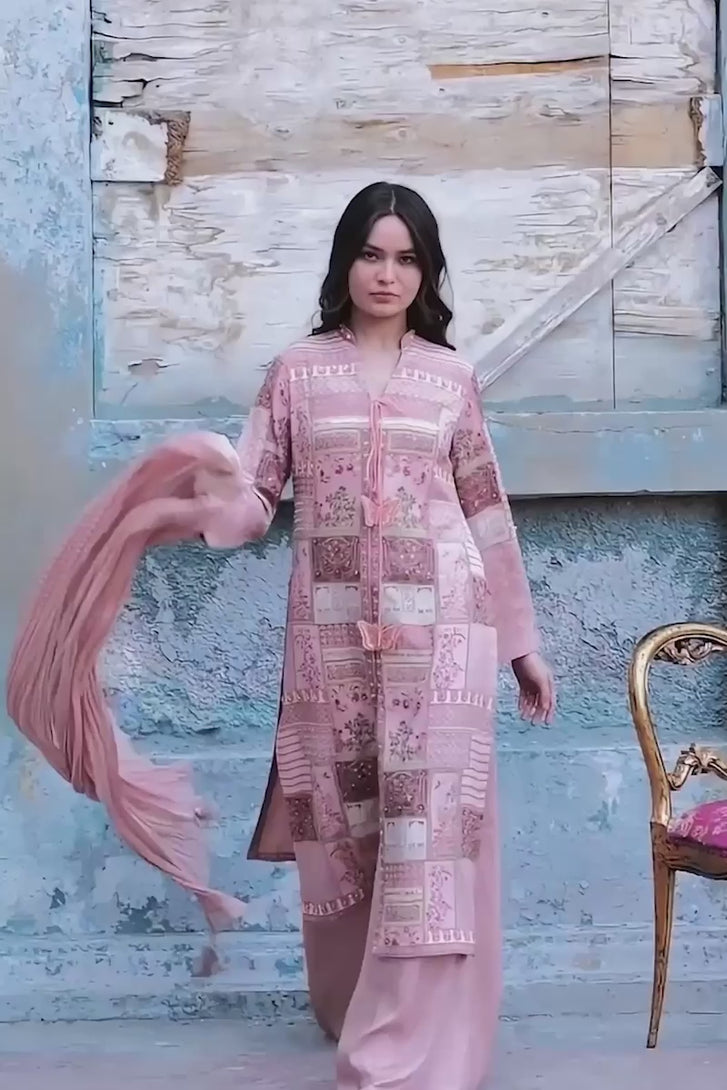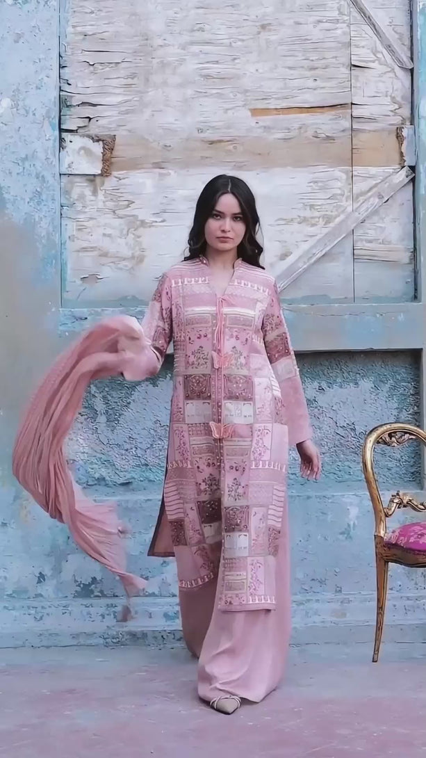 A graceful front-open long shirt crafted in lustrous silk, featuring an intricate mosaic of soft rose and blush tones that evoke quiet elegance. The silhouette flows effortlessly over silk bell-bottom pants, adding movement and a refined sense of balance. Designed for women who appreciate subtle detail and timeless femininity, this ensemble blends heritage-inspired artistry with modern sophistication—perfect for daytime festivities and elegant soirées alike.