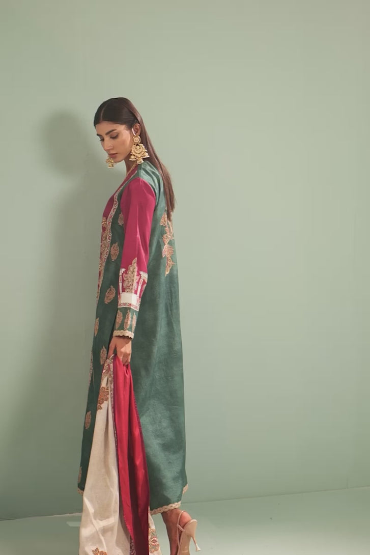 A rich maroon canvas forms the heart of this exquisite ensemble, brought to life with gold-etched florals and baroque-inspired detailing. Contrasting deep green panels frame the silhouette, adding structure and timeless poise. The hem features a stunning scenic tapestry evoking old-world architecture, garden courtyards, and artistic grandeur. The V-neckline is highlighted with intricate ornamental work, while the sleeves echo the same refined craftsmanship. Paired with coordinated trousers and a beautifully printed stole, this outfit celebrates classic heritage artistry with a modern, stately presence.